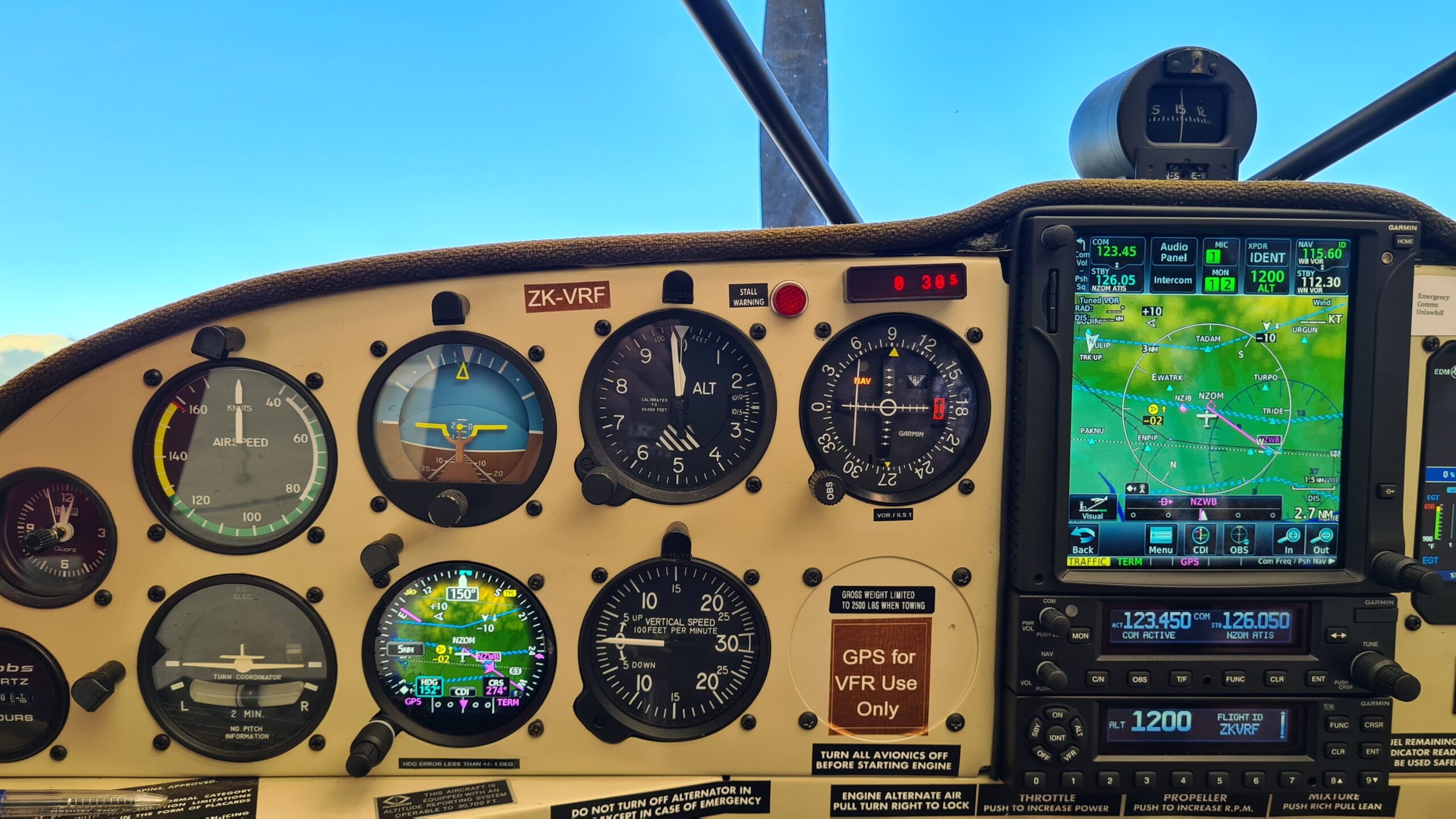 Garmin G3x Primary Flight Display, Garmin G5 Standby Flight Display, Garmin GMA345 Audio Control Panel, Garmin GNX375 GPS Navigator with ADS-B In/Out Transponder, Garmin GNC255 Nav2/Com1, Modified Instrument Panel.