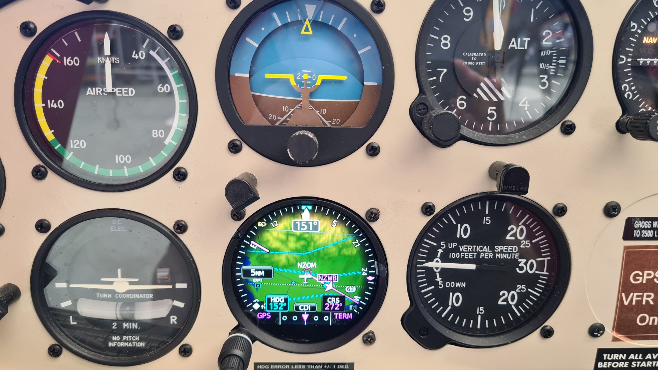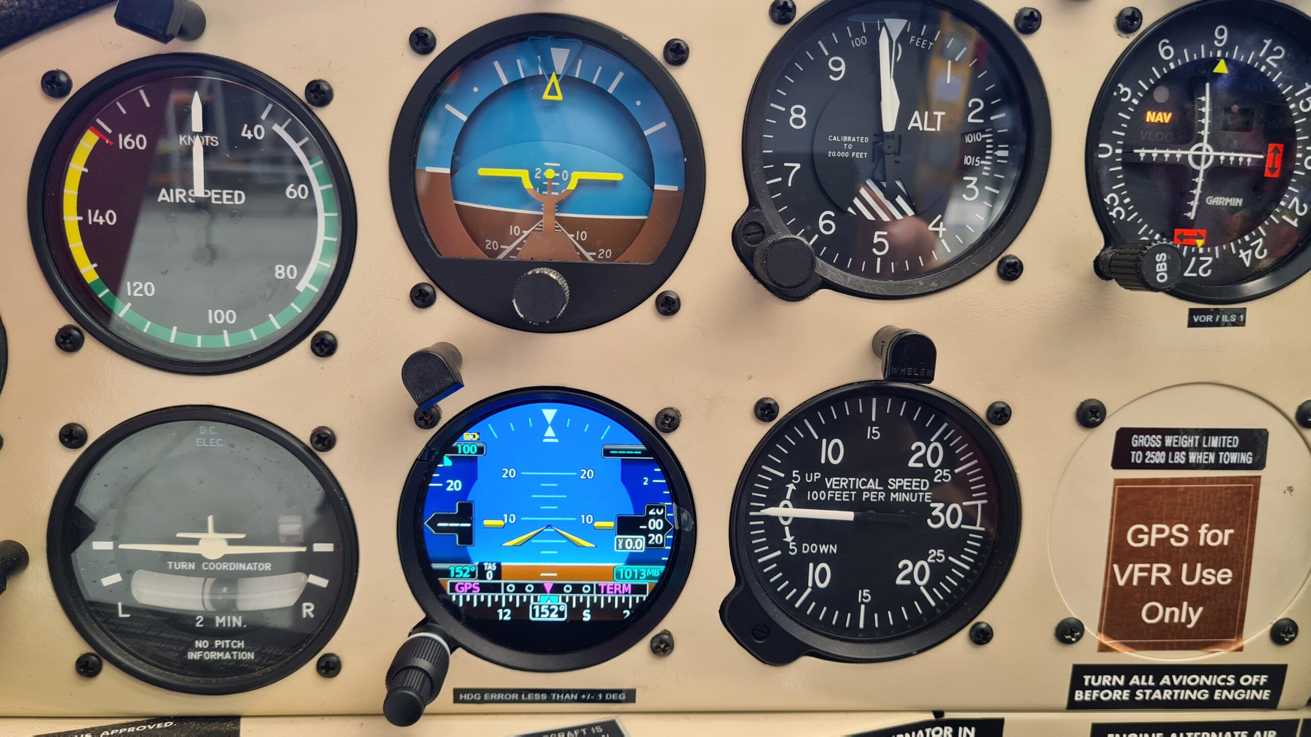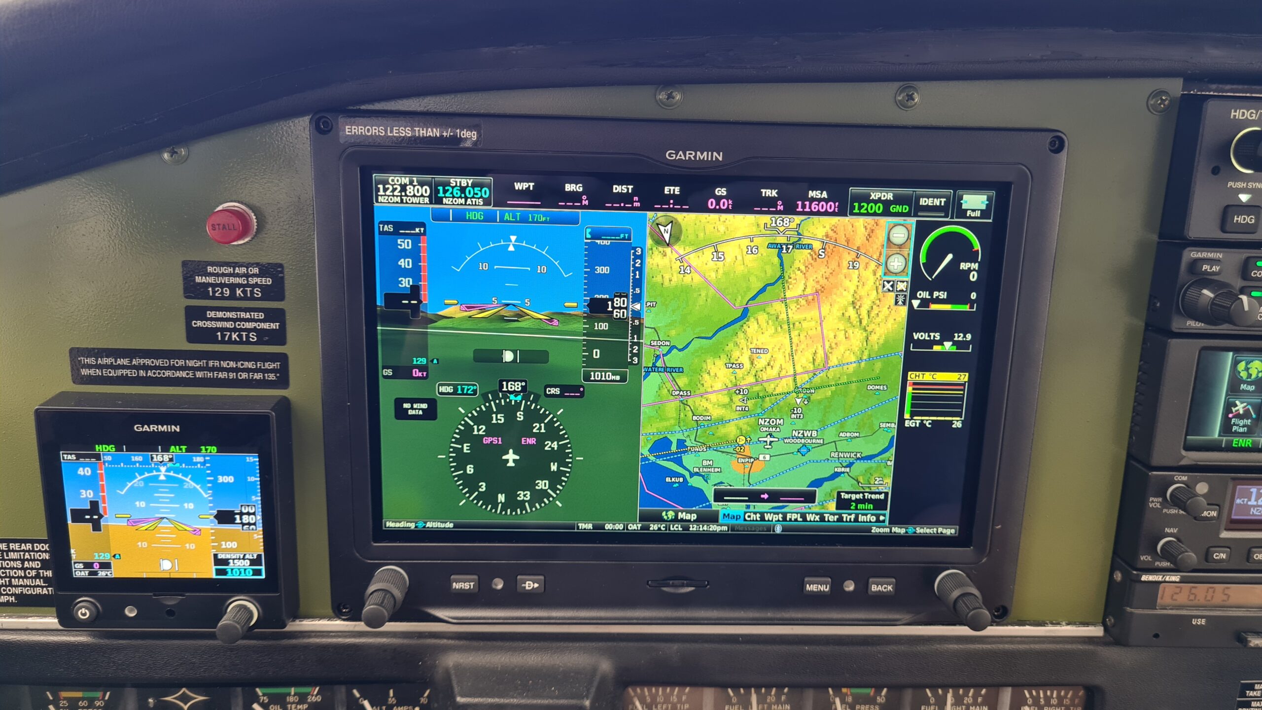 Garmin G3x Primary Flight Display, Garmin G5 Standby Flight Display, Garmin GFC500 Autopilot, Garmin GMA345 Audio Control Panel, Garmin GNX375 GPS Navigator with ADS-B In/Out Transponder, Garmin GNC255 Nav2/Com1, Modified Instrument Panel.